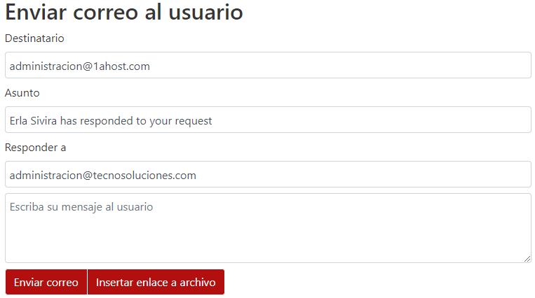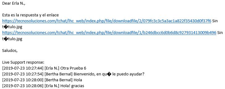 El Operador puede enviar un email directo al Visitante con el contenido de lo conversado, agregar comentarios particulares e incluso puede adjuntar un archivo a través de un enlace para su descarga.