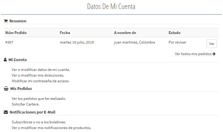 Ahora bien, una vez que el usuario registrado ingrese el Email y Contraseña, tiene acceso a un menú de opciones con información sobre su cuenta particular, donde puede hacer modificaciones de sus datos, ver pedidos realizados, suscribirse al boletín y/o a recibir notificaciones (novedades) sobre algún producto en específico, concretar pedidos, entre otros.