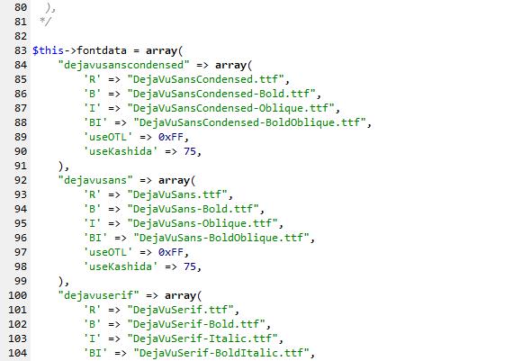 - En el archivo que hemos abierto config_fonts.php, alrededor de la línea 83: “$this->fontdata=array” puede ver cómo se definen otras fuentes.