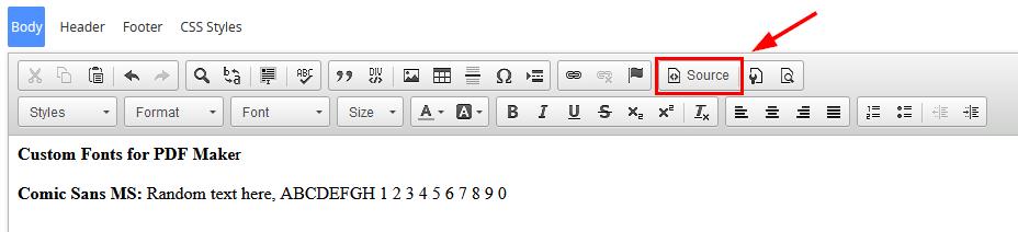 - Abra la plantilla con su texto y haga clic en el botón “Fuente” a través del diseño del CKEditor.