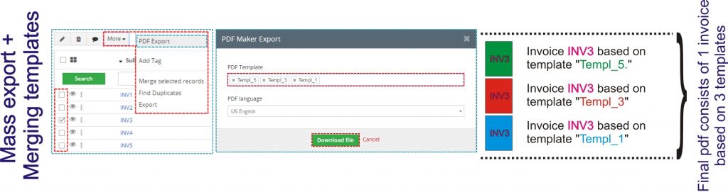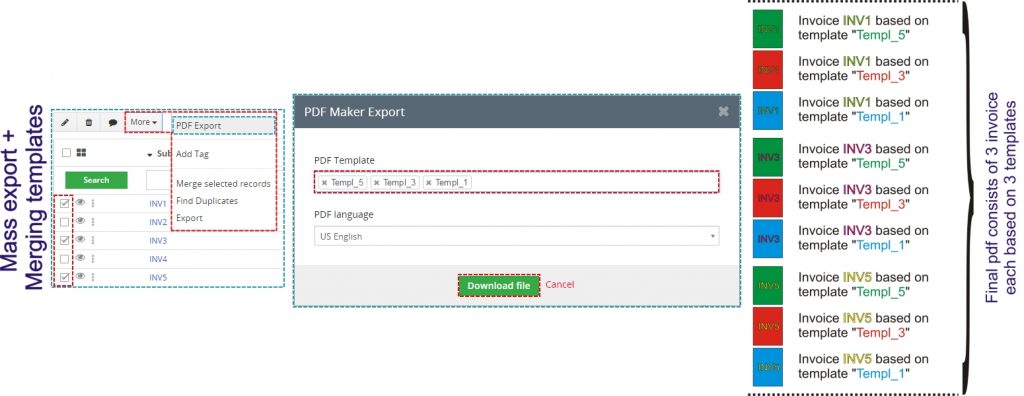 La combinación de plantillas le permite imprimir uno o más documentos usando más plantillas a la vez. La siguiente imagen muestra la fusión de las plantillas: