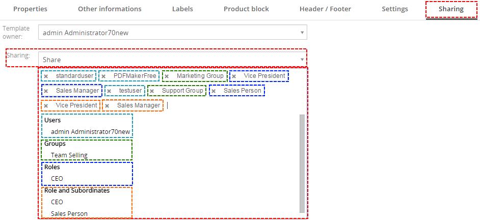 Con la pestaña Compartir puede definir el propietario de la plantilla y cómo compartir su plantilla entre usted y otros usuarios o grupos. Puede configurar el uso compartido para diferentes entidades y miembros. Para compartir su plantilla: