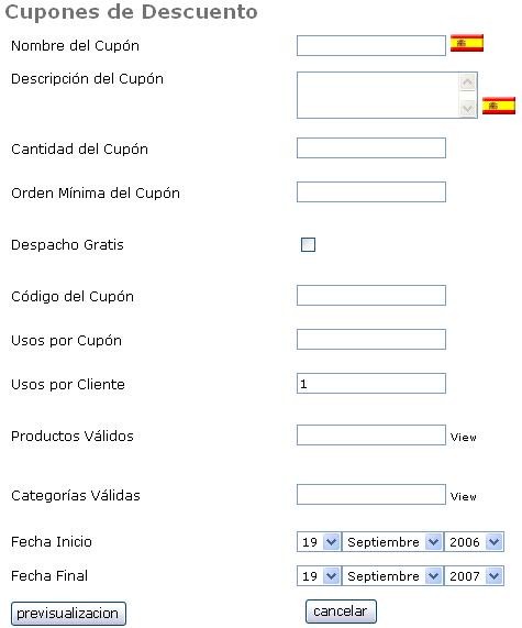 - Crear, modificar y/o eliminar Cupones de Descuento incluyendo parámetros como: Nombre, descripción, cantidad, orden mínima, despacho incluido, código, usos permitidos, productos válidos, categorías válidas, fecha inicial y fecha final.