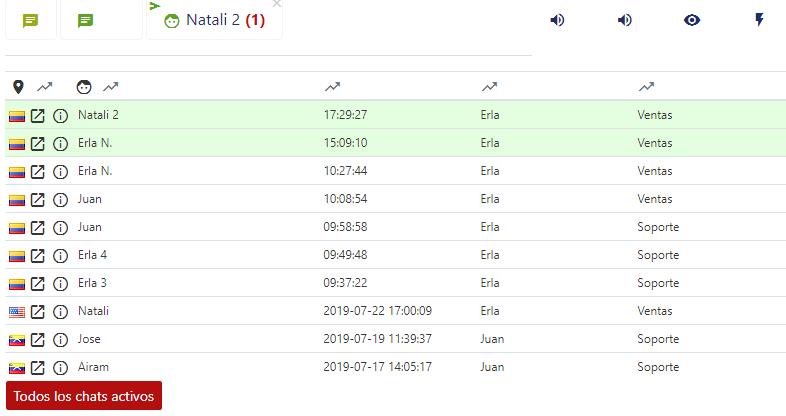 Abre una pestaña por separado con los Chats en espera de Confirmación, Chats Activos y en su parte superior se puede ubicar en una forma gráfica los chats activos y no activos. Al hacer clic sobre cualquier de ellos, se procede con la interacción correspondiente.