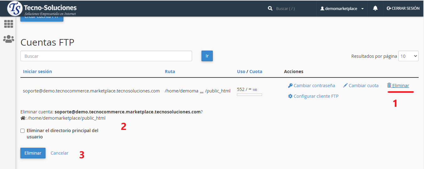 Para eliminar una cuenta FTP, realice los siguientes pasos: