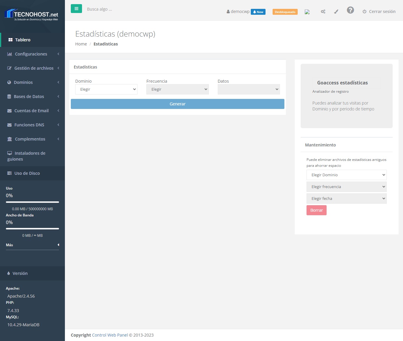 Para conocer las estadísticas de visitas, seleccione el dominio y la frecuencia (diaria, semanal o mensual) y haga clic en generar.