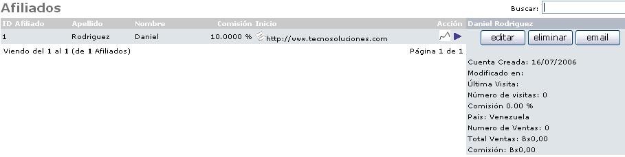 - Asociados / Afiliados: Lista todos a todos los Afiliados a éste módulo, con sus datos básicos y opciones para editar, borrar o enviar un email. Tal como se muestra a continuación:
