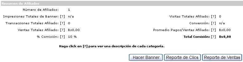 - Resumen: Muestra un reporte general de los totales respecto al número de afiliados, número de impresiones, transacciones, ventas, porcentajes, visitas, comisión, entre otros.