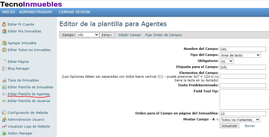 Debido a que el Portal TecnoInmuebles es completamente flexible, es posible configurar campos adicionales al formulario para el registro de los Agentes. Es decir, el formulario para el registro de Agentes tiene un formato estándar en el sistema que es el que se muestra en el registro inicial del mismo, a esta plantilla es posible agregarle campos que sean de interés para obtener mayor información sobre el Agente. Dichos campos adicionales se mostrarán al final del formulario cuando se desee editar los datos de un Agente (Formulario Ampliado, Ver: Punto 2.2 de este capítulo).