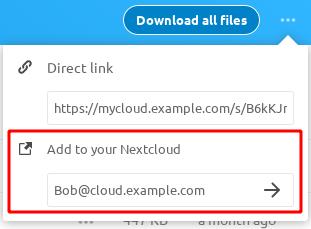 Las páginas para compartir enlaces públicos de TecnoCloud ofrecen una opción para agregar ese archivo o carpeta como un recurso compartido federado en su propia instancia de TecnoCloud. Simplemente ingrese su <usuario>@<url-servidor-tecnocloud> tal como se muestra para las acciones arriba: