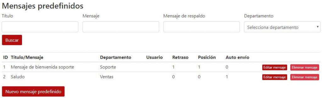 Como se puede observar, inicialmente muestra un buscador e inmediatamente lista los Mensajes ya creados (existentes) con las opciones de Editarlos o Eliminarlos.