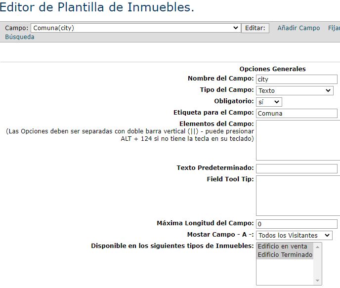 Este módulo permite configurar los campos que conforman el formulario (plantilla) para la colocación (registro y publicación) de inmuebles en el Portal. Conformando una plantilla ajustada a los requerimientos de la inmobiliaria en su comercialización de inmuebles.