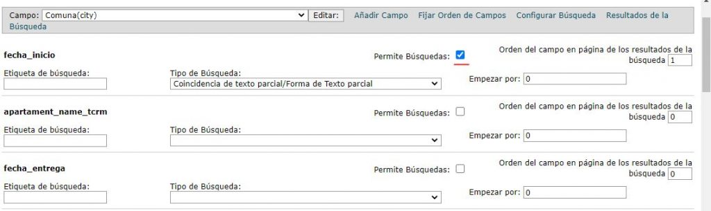 - Orden del Campo: escribir el número que permite indicar el orden que aparecerá el campo en la página de búsqueda.