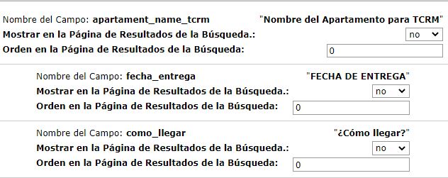 - Mostrar en la página de resultados: seleccionar si se va a mostrar o no este campo cuando se realiza una búsqueda. (Por ejemplo, actualmente al realizar una búsqueda aparece por cada inmueble, además de la fotografía, la Dirección, Ciudad, Estado, mts2 y precio).