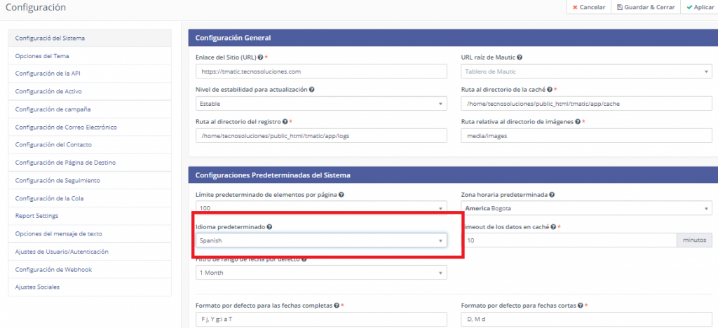 En la configuración de TecnoMatic se puede configurar el idioma predeterminado. Está preestablecido en Spanish de forma predeterminada. Cada usuario verá este idioma si no configura su idioma en su perfil.