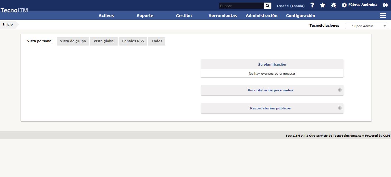 La página de inicio de la interfaz estándar proporciona una vista de resumen para acceder rápidamente a los elementos activos (peticiones, notas, planificación, contratos, etc.).