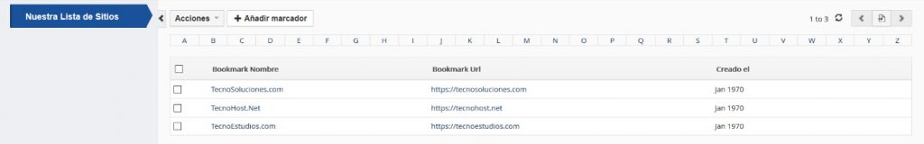 Antes de que pueda ver cualquier sitio web en el menú Herramientas > Nuestros Sitios, necesita marcar una dirección de Internet de un sitio. Haga clic en [Gestionar Sitios] y luego en el botón [Nuevo Favorito] para agregar un nuevo sitio web. Luego haga clic en [mis sitios] para ver los sitios marcados.