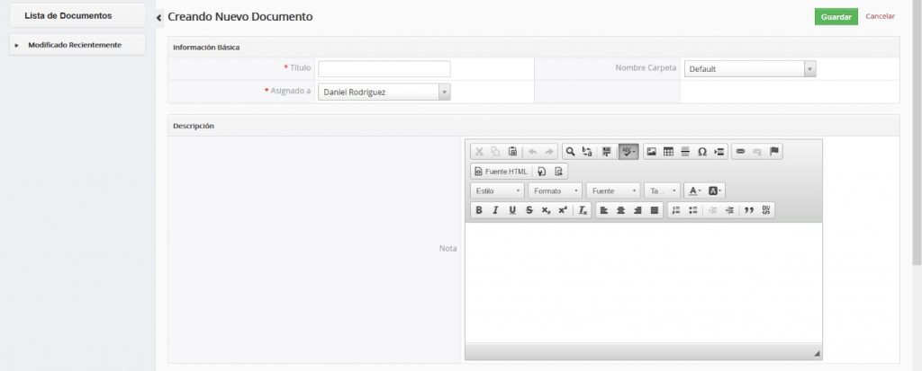 También puede agregar documentos directamente en las vistas de detalle de ciertos módulos de TecnoCRM y enlazar archivos a los documentos.