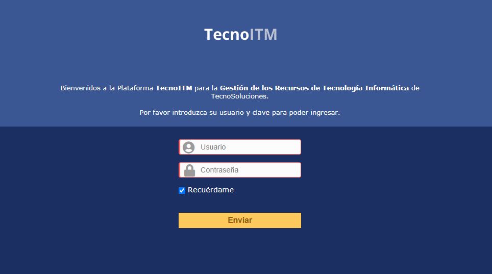 Inicie el navegador en la página de inicio de TecnoITM https://itm.<TECNOITM_ADDRESS>.com. El acceso a la funcionalidad completa de la aplicación requiere autenticación. Dependiendo del perfil del usuario autenticado, la interfaz ofrecida es la interfaz estándar o la interfaz simplificada.