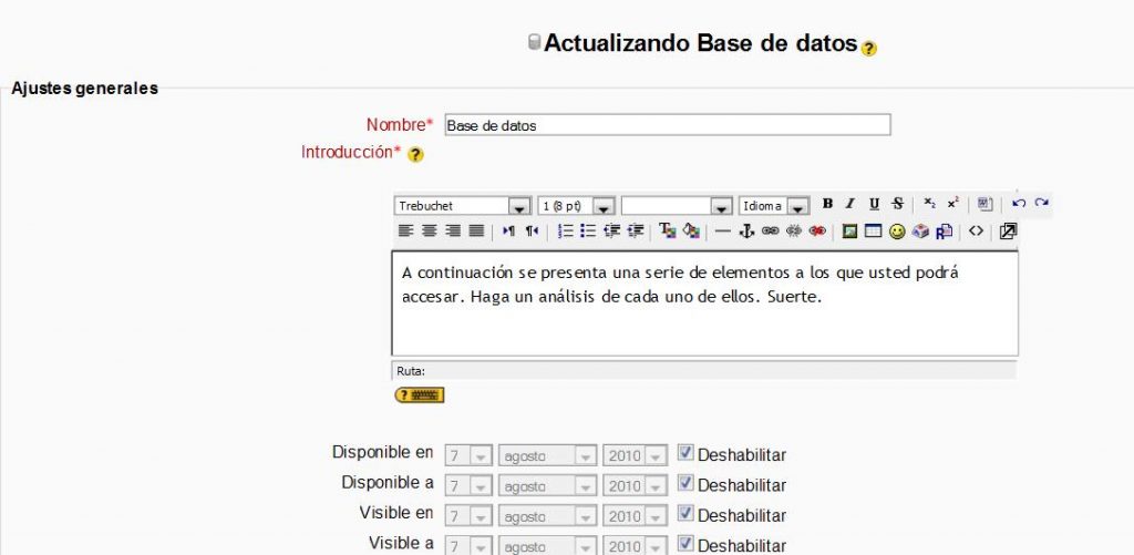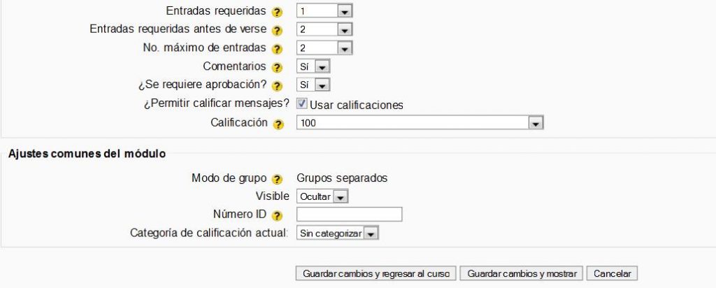 Podemos habilitar la revisión del profesor antes de que las entradas sean públicas. La base de datos es una actividad del curso y la página de los ajustes de la base de datos contiene los siguientes aspectos: