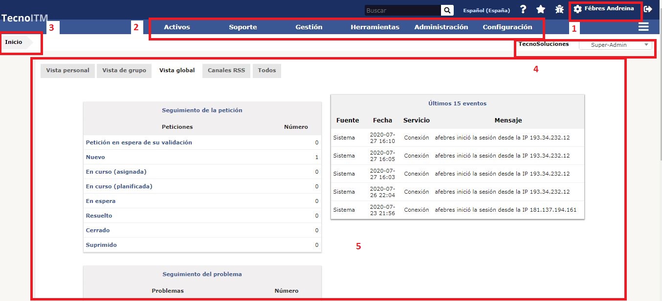 La interfaz TecnoITM se compone de cinco áreas que agrupan las funcionalidades de la aplicación según su naturaleza.
