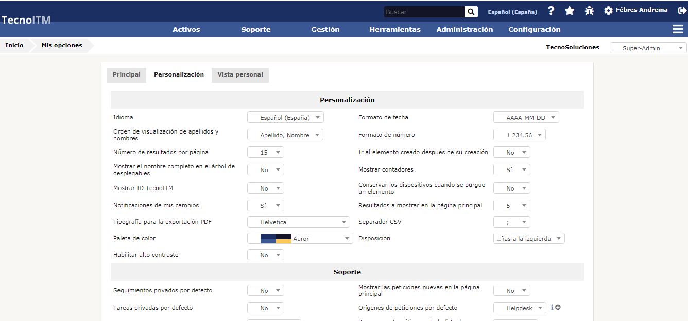 - valores predeterminados para nuevos peticiones (por ejemplo, preselección del usuario como técnico al crear un petición) y seguimientos,