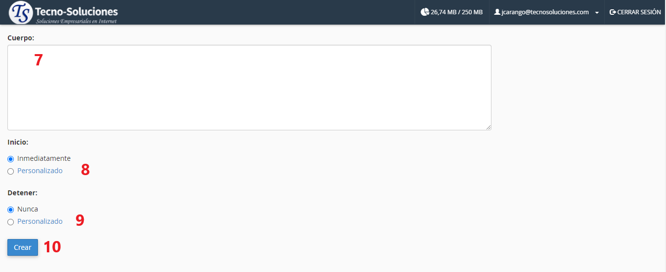 7. En el cuadro de texto Cuerpo , ingrese el texto de la respuesta, por ejemplo: