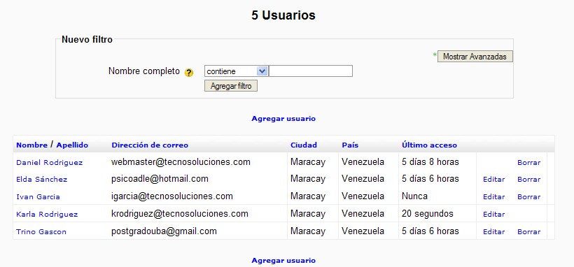 En él se encuentran el listado de todos los usuarios del curso, su dirección de correo, la ciudad de origen el país, último acceso, la opción de ser editado o borrado.