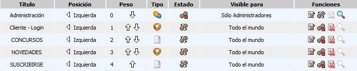 El sistema se presenta inicialmente con una lista de los bloques que se han creado (previamente programados) dando información sobre: Título, posición (de aplicar), orden / peso (de aplicar), tipo, estado, para quién esta visible y funciones asociadas. Por lo que pueden ser editados, activados (), desactivados () o corregidos cambiando su posición / orden y la asignación de permisos. De hecho es posible decidir si un bloque será visible para todos, ó sólo por los usuarios registrados, o por el administrador. También es posible hacer el bloque visible sólo en un idioma específico. Ejemplo: