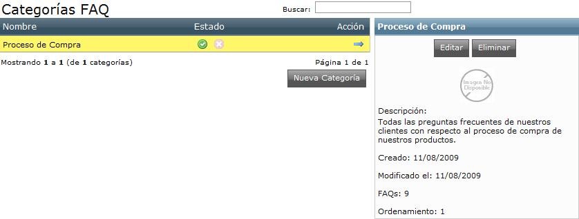 Para crear las categorías y subcategorías de las preguntas y respuestas correspondientes. En la página principal muestra el listado de las categorías ya existentes con opciones de editar, eliminar y/o mover.