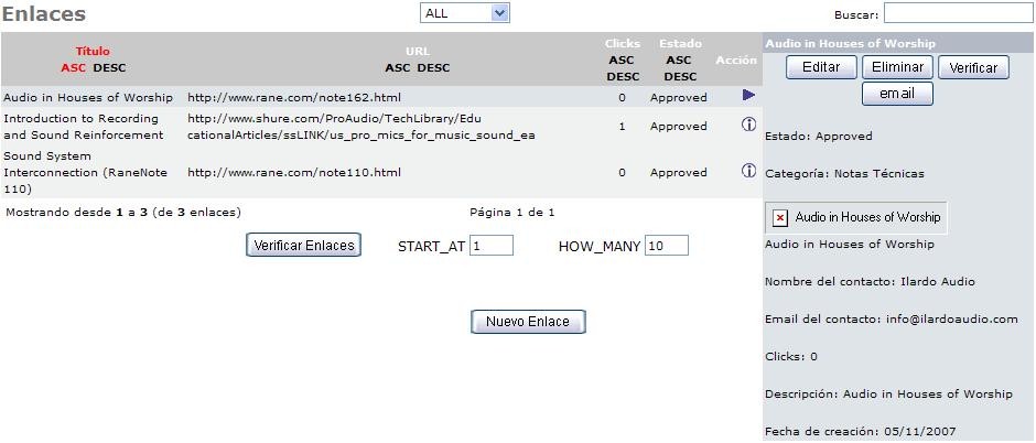 Lista los enlaces publicados en el portal con datos como: título, URL, clicks, estado y opciones para editar / eliminar / chequear enlace / enviar un email a los registrados en ésta sección, también pueden ser ordenados en forma ascendente o descendente. A continuación u ejemplo general sobre dicho listado: