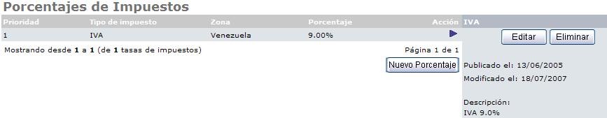 Listado de los impuestos con sus datos principales, similar al anterior, pero muestra el nivel de prioridad y el porcentaje del impuesto. Es donde se asocia la Zona de Impuestos con los Tipos de Impuestos y se establece su valor, descripción y prioridad. A su vez, es posible eliminar / editar porcentajes de impuestos existentes o agregar nuevos. Ejemplo: