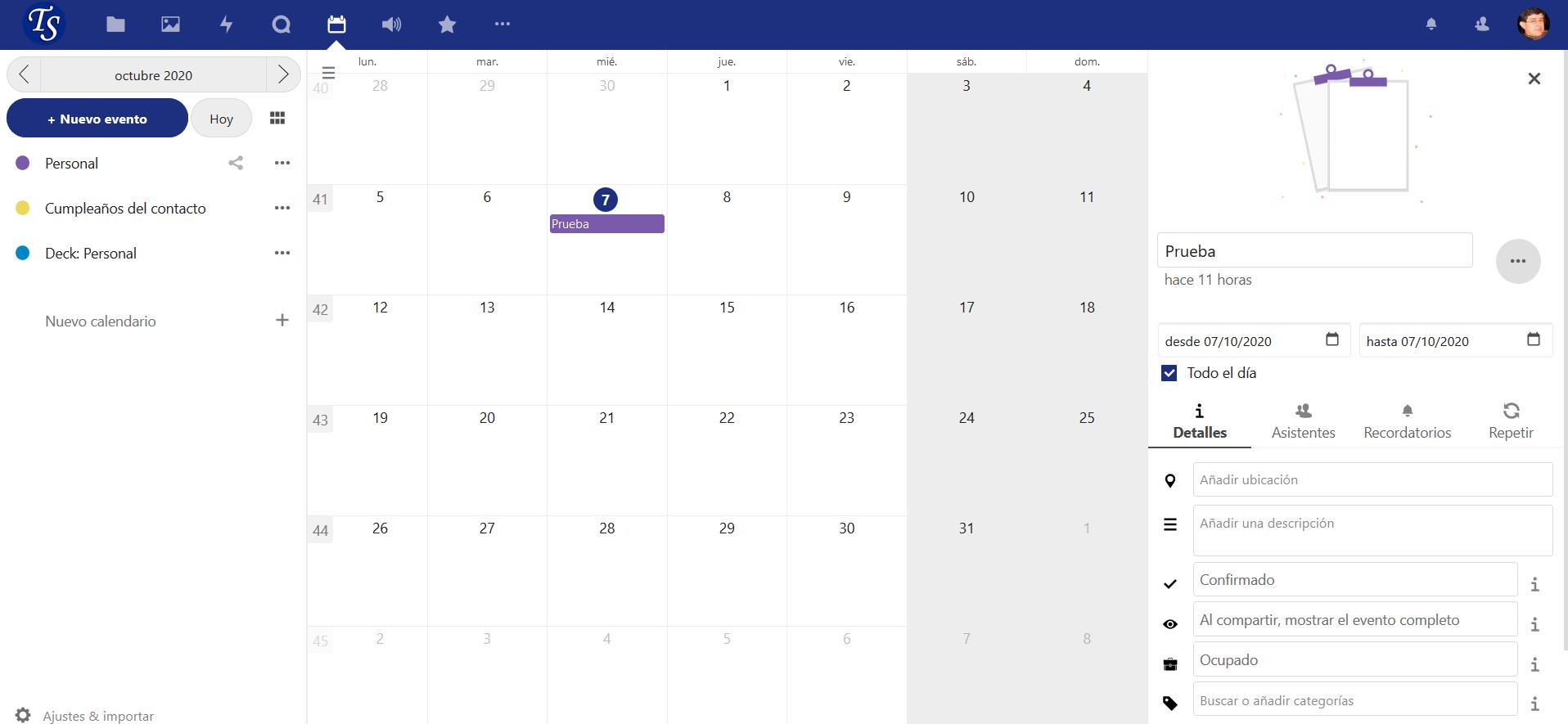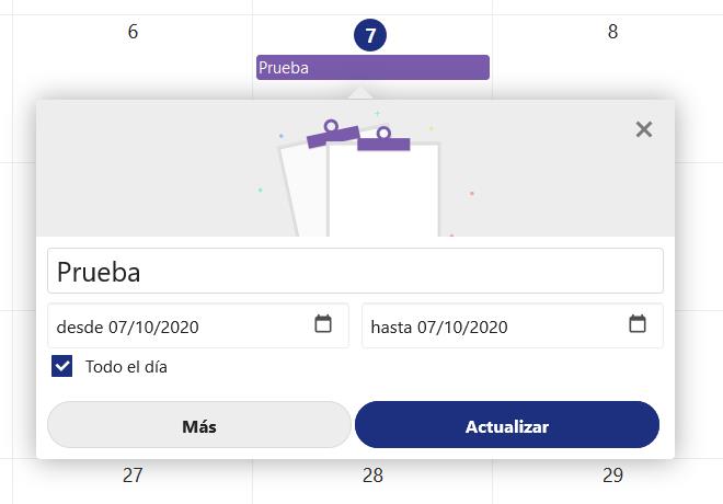 Al hacer clic en el botón azul [Actualizar] se actualizará el evento. Para cancelar sus cambios, haga clic en el icono de cierre en la parte superior derecha del editor de la barra lateral o la ventana emergente.