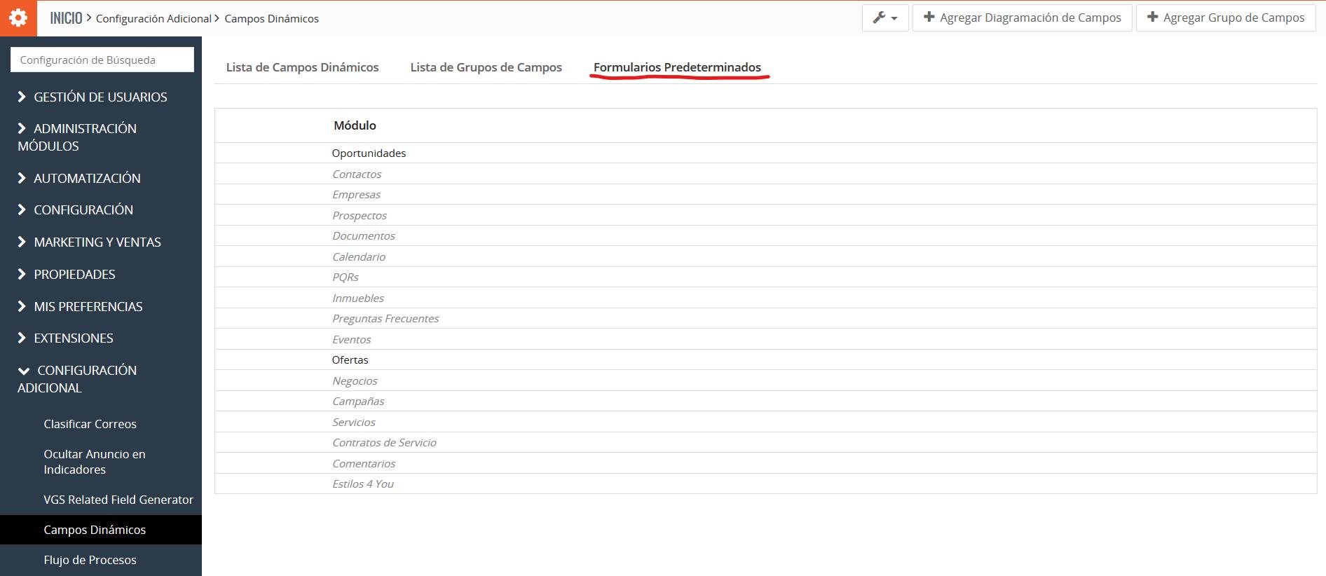 Con el módulo de Campos Dinámicos también puede editar sus campos y bloques para todos los módulos que son predeterminados en la plataforma TecnoCRM. Puede hacerlo a través de la pestaña de Formularios Predeterminados.