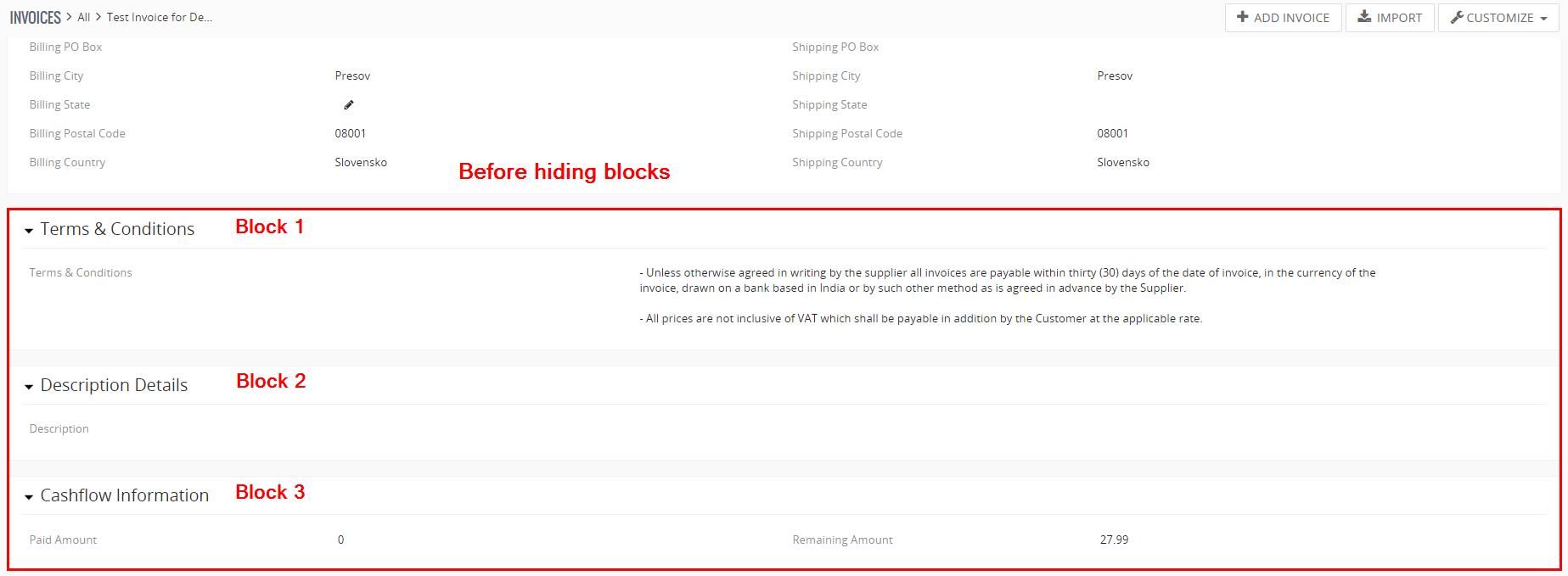 - Como ejemplo, queremos ocultar los bloques: Términos y condiciones, Detalles de descripción e Información de Flujo de Caja (módulo premium adquirido por separado).