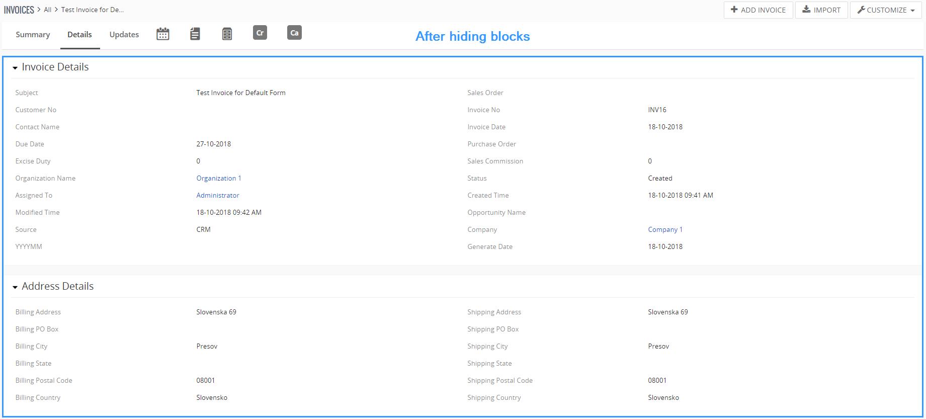 Ejecute los siguientes pasos para editar los bloques de formulario predeterminados (como ejemplo, usamos el módulo Facturas):