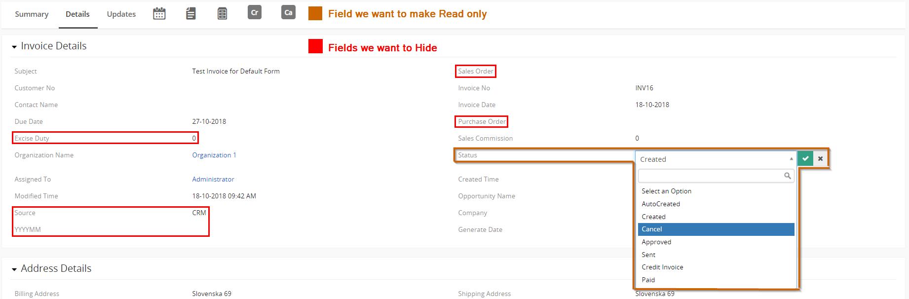 - Como ejemplo, queremos ocultar los campos: Orden de venta, Orden de compra, Fuente, AAAAMM, Impuesto especial y hacer que el campo Estado sea de solo lectura.