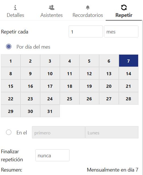 Un evento puede configurarse como “recurrente”, de modo que pueda suceder todos los días, semanas, meses o años. Se pueden agregar reglas específicas para establecer qué día de la semana ocurre el evento o reglas más complejas, como el cuarto miércoles de cada mes.