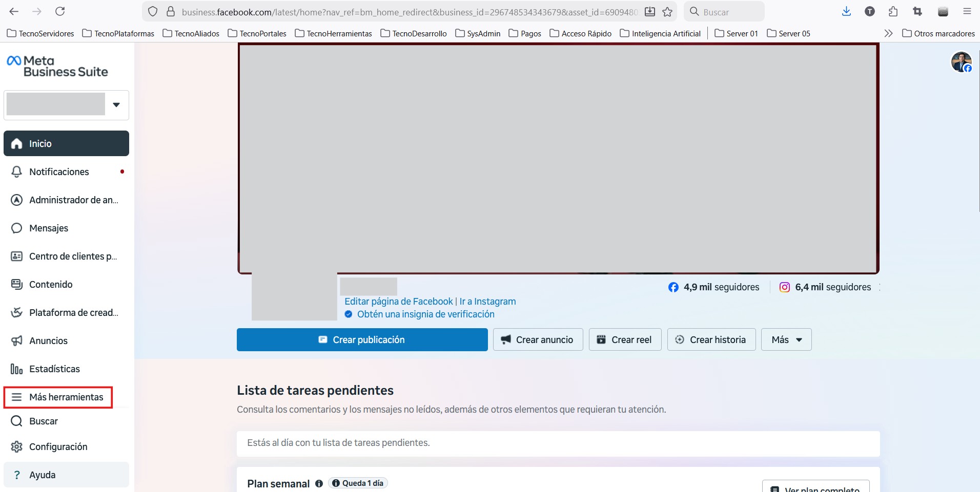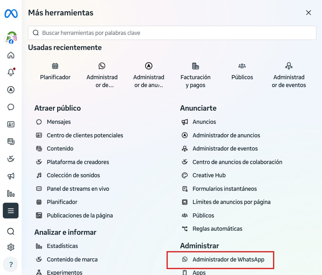 Una vez que inicie sesión en la página, despliegue el menú hamburguesa de “Más Herramnientas”, apartado Adminsitrar > Administrador de WhatsApp.