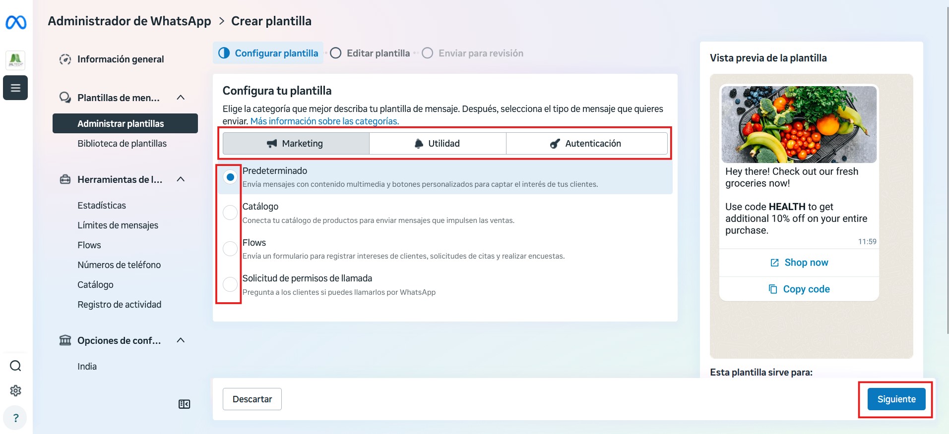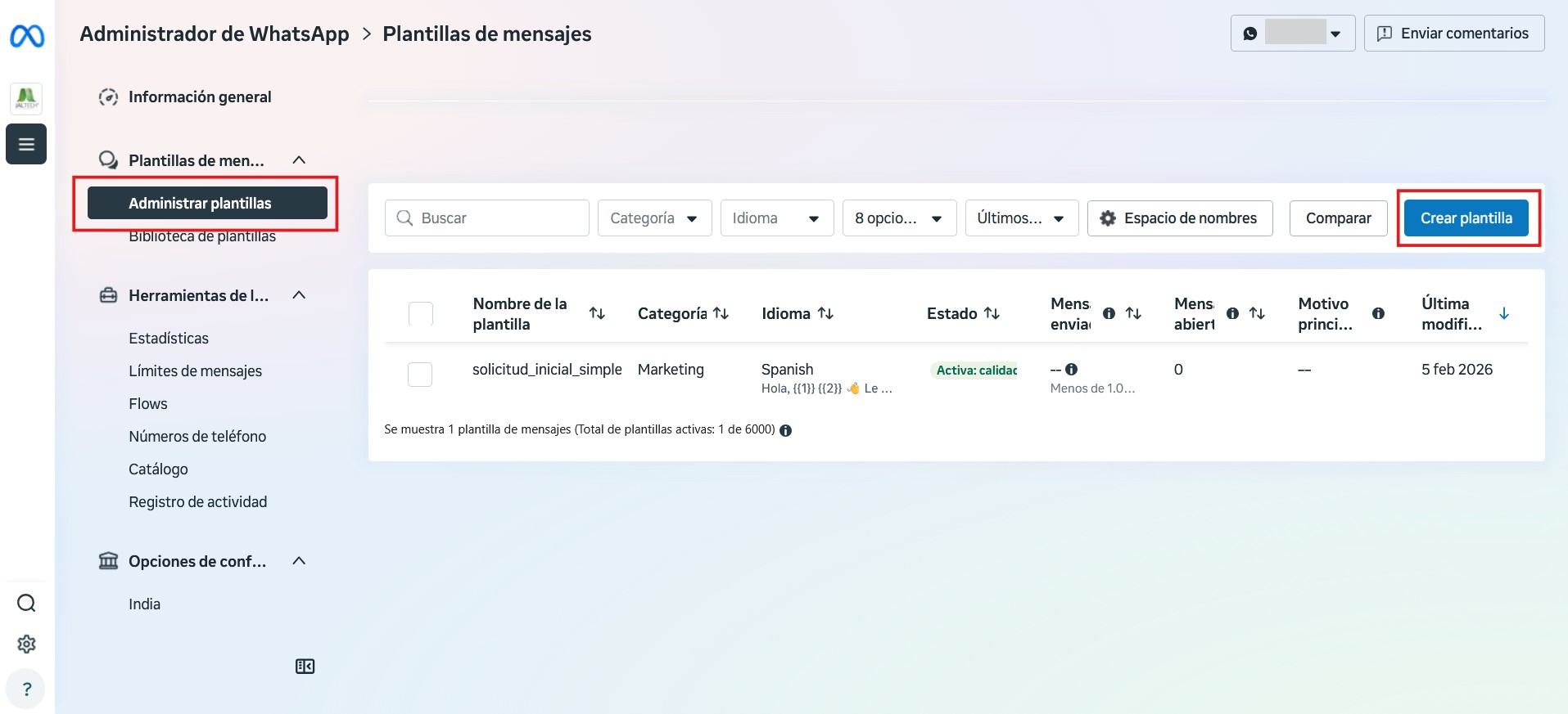 Una vez allí, vaya a Plantillas de Mensajes > Administrar Plantillas. Allí podrá ver el espacio de trabajo para plantillas. Para crear una nueva, haga clic en el botón “Crear Plantilla” ubicado en el lateral derecho.