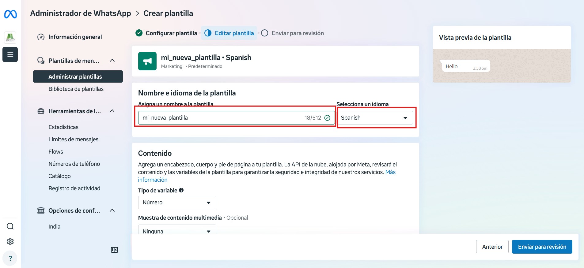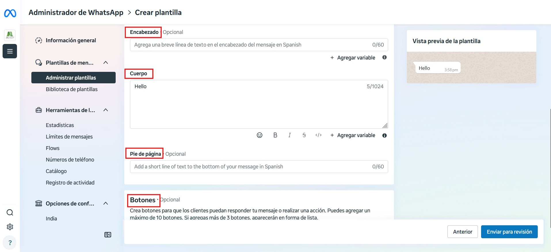 Luego, en la sección inferior podrá agregar un encabezado, cuerpo, pie de página y botones a la plantilla. Finalmente, al hacer clic en el botón “Enviar para Revisión“, se creará la plantilla.