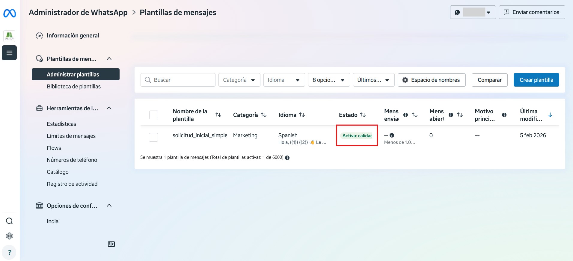 Después de creada la plantilla, se enviará a Facebook para su aprobación y los usuarios podrán ver el estado de la plantilla creada en la página de lista, columna “Estado”.
