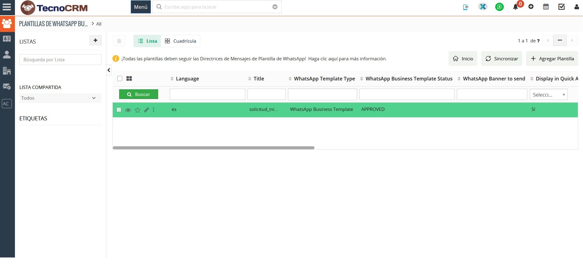Una vez que Facebook aprueba la plantilla, se sincronizará automáticamente con la lista de plantillas de WhatsApp Business de TecnoCRM.