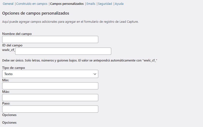 - Tipo de campo (los tipos admitidos actualmente son: texto, área de texto, número, correo electrónico, URL, selección, radio, casilla de verificación).