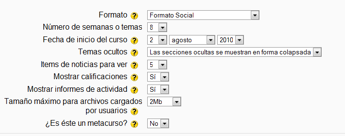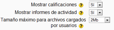 Tamaño máximo de archivos: Define lo que su nombre indica. Este límite es aplicable a archivos adjuntos en foros, wikis, glosarios, etc. y archivos entregados como producto en tareas o talleres. Este es un límite genérico para el curso completo. Se pueden establecer otros límites inferiores en la configuración de cada actividad completa. Si se quiere ampliar el límite, habría que avisar al administrador del servidor para que cambie el archivo de configuración del PHP.
