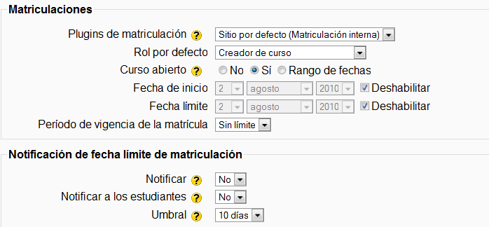 Fecha de inicio del curso: Es la fecha en la que comienzan las clases de la asignatura. Esta opción es la base sobre la que se construyen las cajas semanales en el formato semanal.