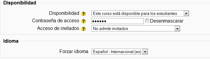 Disponibilidad: Indica si la asignatura es visible para los alumnos y así como si pueden entrar y empezar a trabajar con el curso. Normalmente (salvo que se importe el curso) hay un periodo en el que no están disponibles: el tiempo que les lleva a los profesores preparar todos los contenidos.