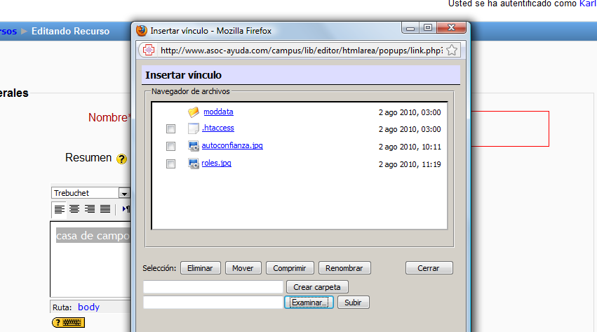 Los detalles del uso del gestor de archivos de TecnoLearning se describen más adelante en la sección de gestión y administración del curso.