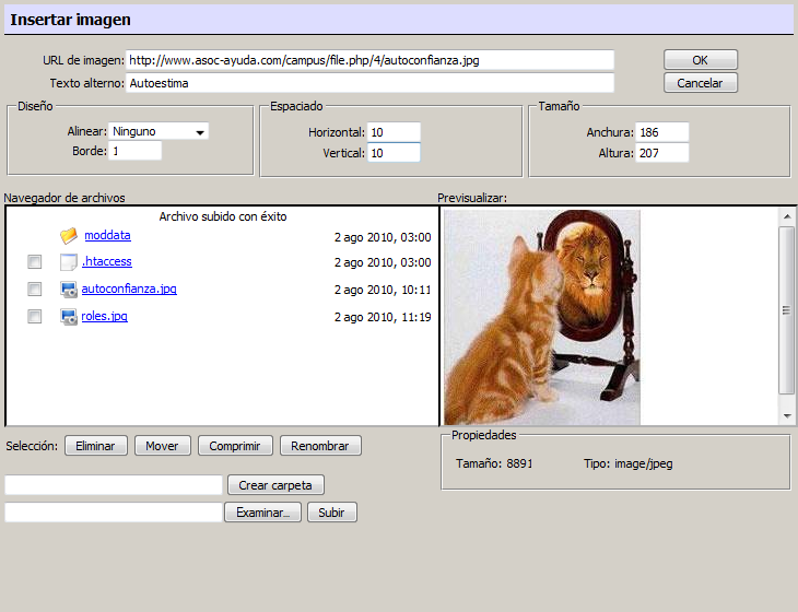 - Puede seleccionar cualquier archivo de imagen (en formatos adecuados para la Web: gif, jpg, png, tiff) del servidor o bien buscar uno y cargarlo desde su computador personal al servidor (recordamos que mientras no esté en el servidor no se verá la imagen en la Web).