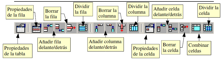 Para facilitar la tarea de editar una tabla, el editor dispone de una barra de herramientas específica para el manejo de tablas, la cual observamos a continuación: